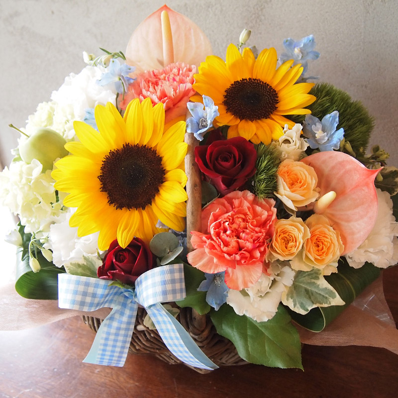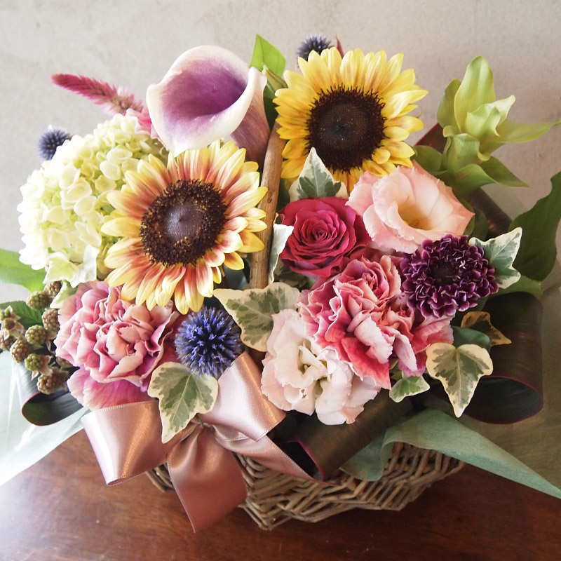 夏から秋へと市場のお花もだんだんと移り変わる時期。夏の代表花、ヒマワリや可愛い旬の小花になごり惜しさも感じながら仕上げた季節感たっぷりのアレンジメントをお楽しみください。それでは、2017年8月出荷画像一例です。
